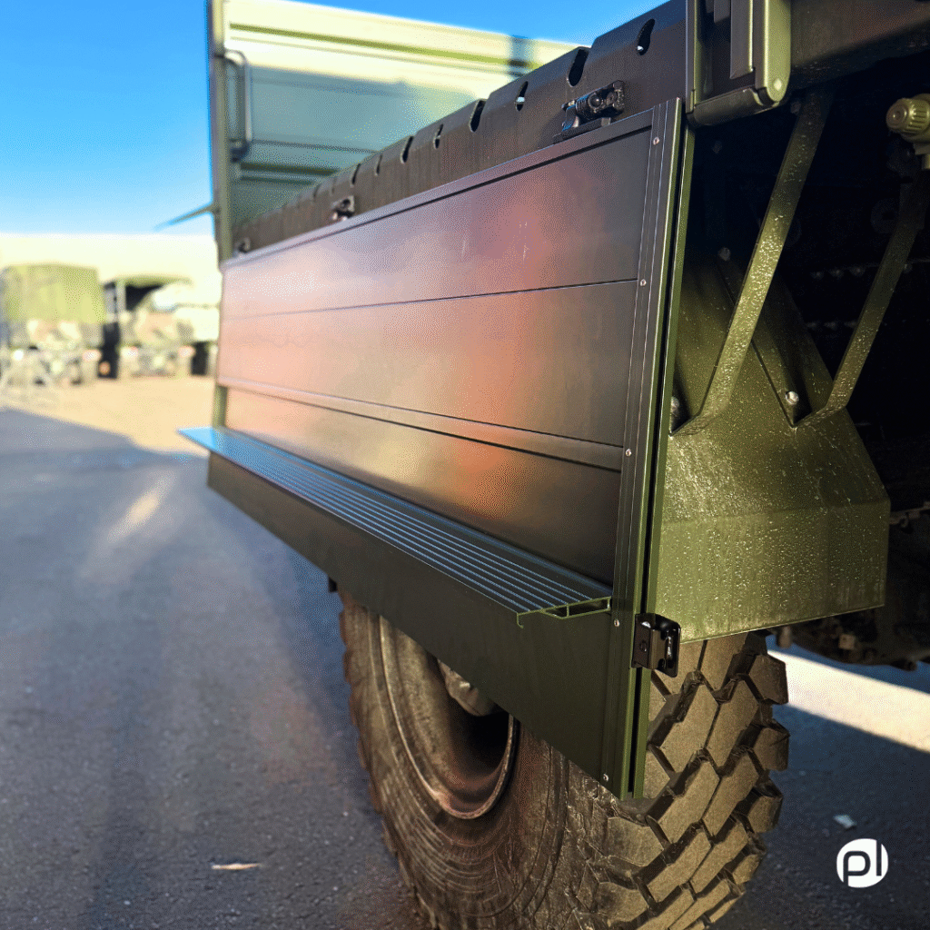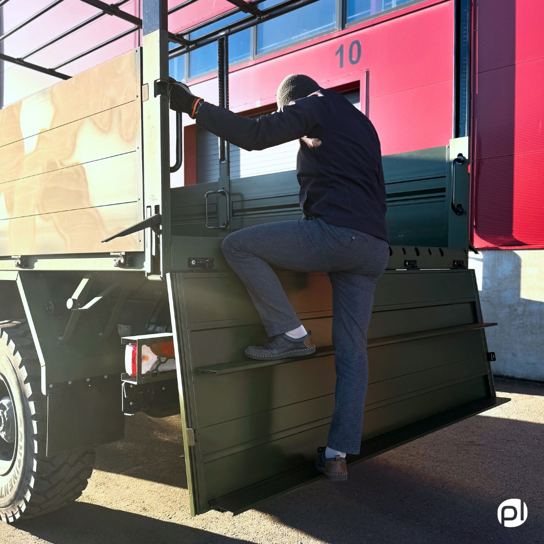 On the vehicle shown in the images, the rear gate serves as the main access point, and due to the vehicle’s height, two steps were installed. In typical applications, one step is usually sufficient.